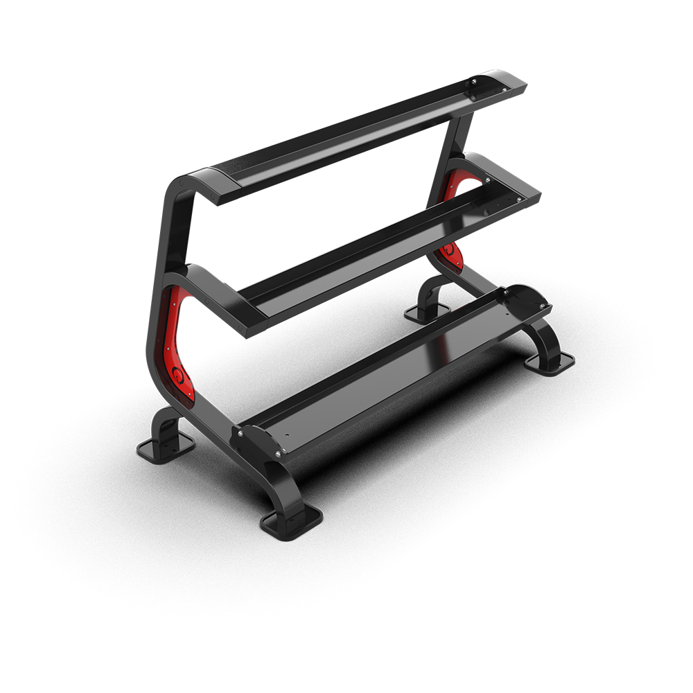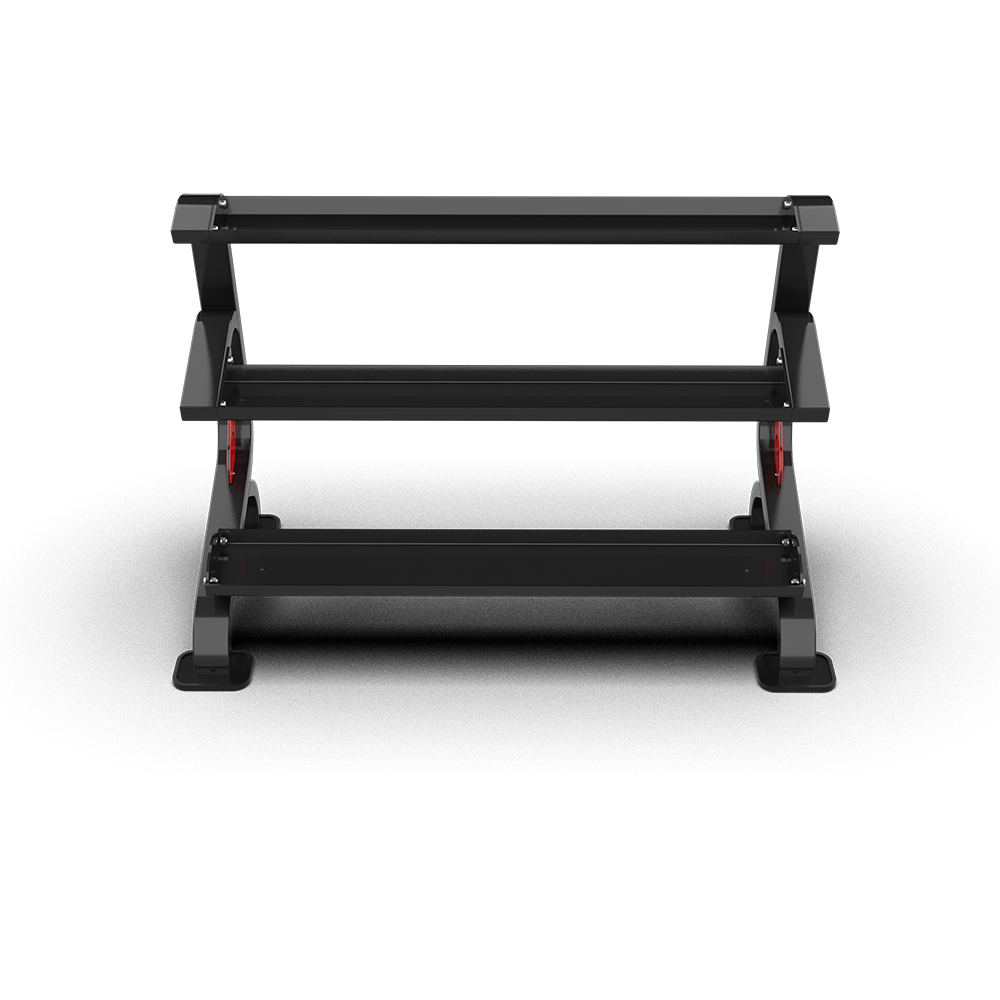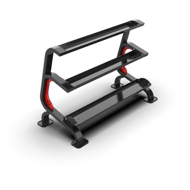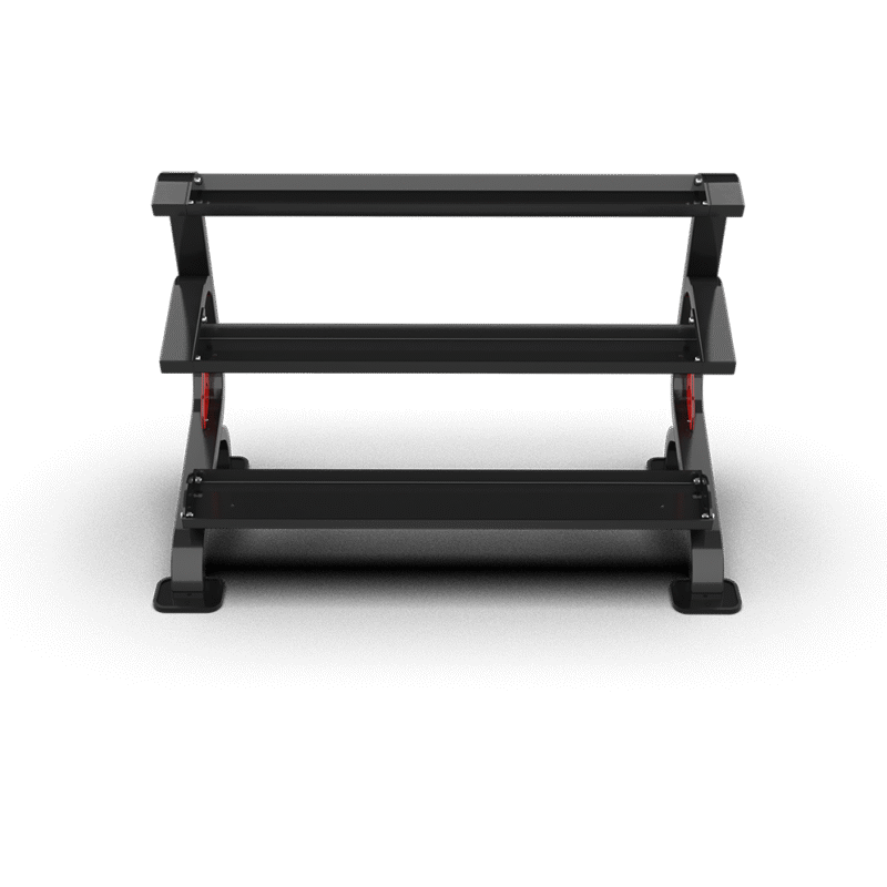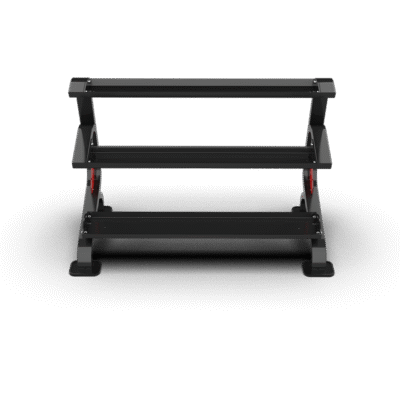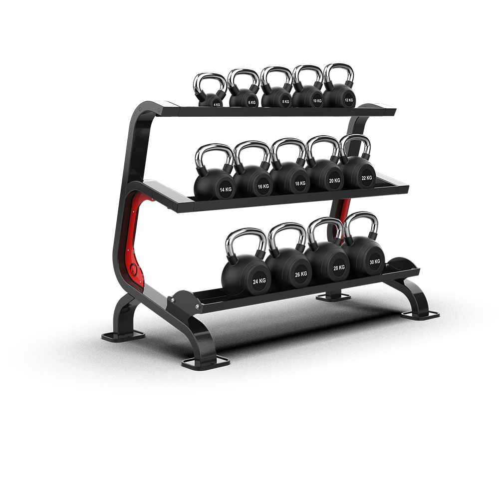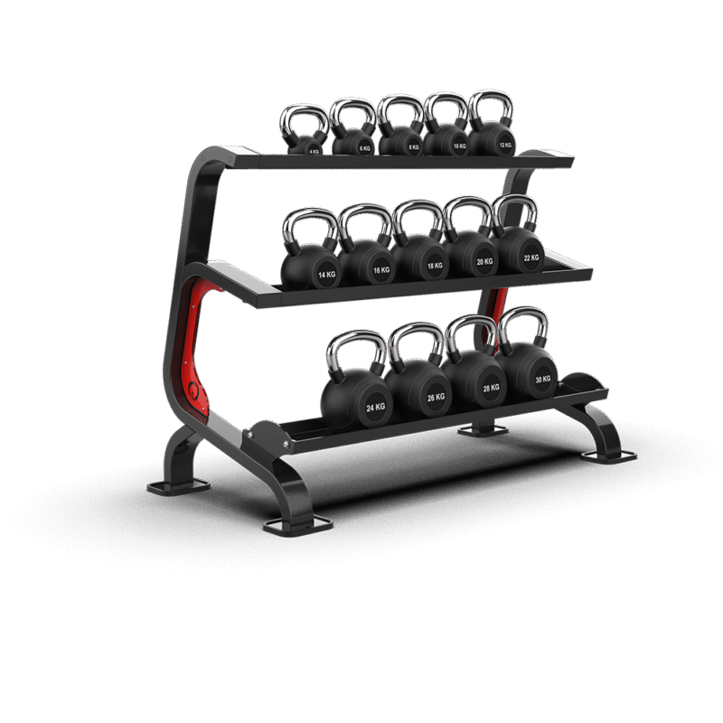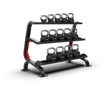- Features a three-tier structure with trays of different sizes, allowing for organized and efficient storage of various kettlebell types.